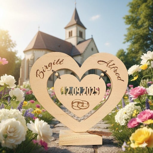 Auf Wunsch wird die Gravur exakt nach deinen Angaben umgesetzt. So entsteht ein persönliches Hochzeitsgeschenk aus Holz, das lange Freude bereitet und die Liebe zweier Menschen in einem besonderen Symbol festhält.