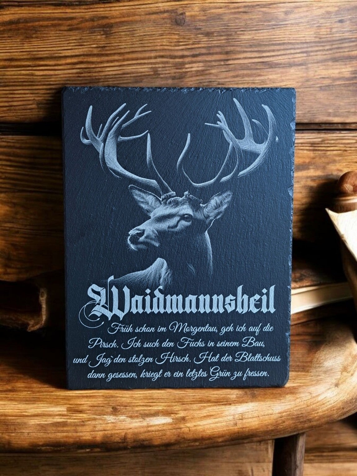 Ein XXL Schiefer Wandbild mit beeindruckendem Jagdmotiv ist mehr als eine Dekoration – es ist ein Geschenk, das die Leidenschaft eines Jägers auf den Punkt bringt. Genau dieses Gefühl fängt unser Jagd-Schieferbild als besonderes Jägergeschenk ein: kraftvoll, naturverbunden und voller Charakter. Das detailreiche Motiv wird präzise in Schiefer graviert, wodurch ein kontrastreiches, langlebiges und absolut einzigartiges Stück entsteht.