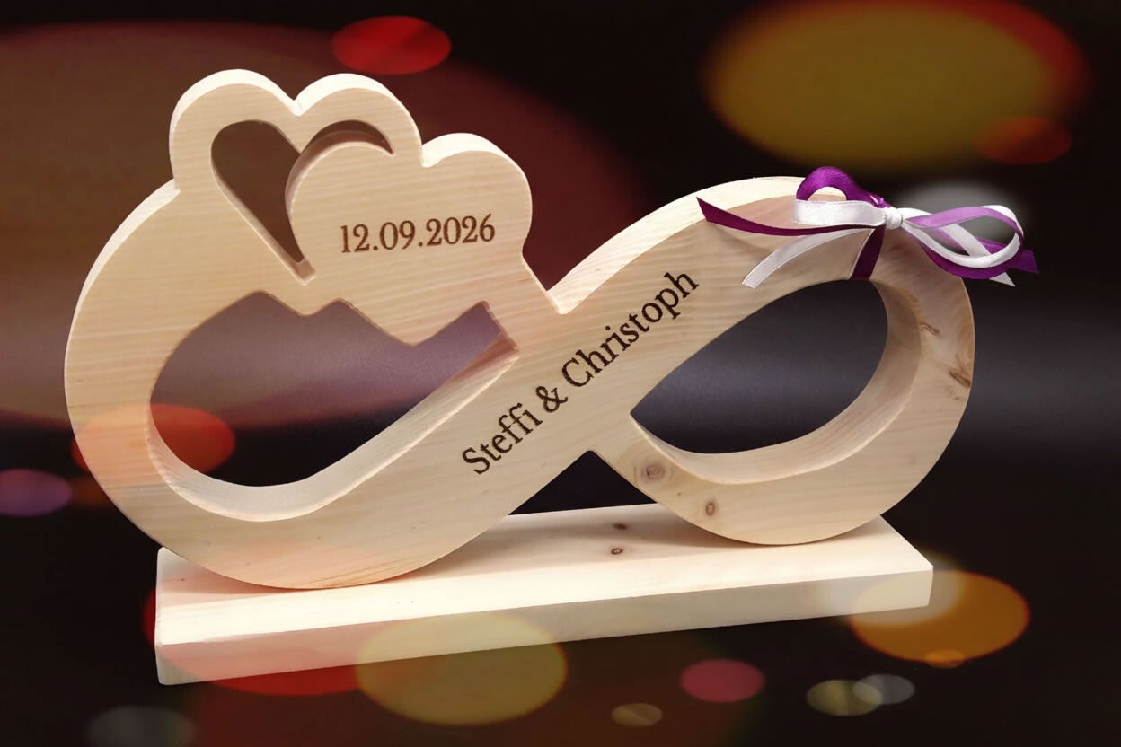 Diese Endlosschleife aus duftenden Zirbenholz ist das Symbol für ewige Liebe und wird dein Brautpaar tief berühren! Mit einer Größe von 300x180x60 mm vereint sie zeitlose Eleganz mit emotionaler Tiefe. Die personalisierte Gravur mit Namen und Hochzeitsdatum macht jedes Stück zum absoluten Unikat – ein Hochzeitsgeschenk, das Herzen öffnet und Erinnerungen für die Ewigkeit schafft.
