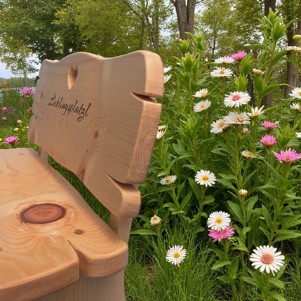 Im Gegensatz zu industriell gefertigter Massenware ist jede dieser Zirbenholz-Blumenbänke ein echtes Unikat. Die natürliche Maserung, kleine Asteinschlüsse und die warmen Farbnuancen machen jedes Stück unverwechselbar. Gefertigt wird sie in traditioneller Handarbeit aus 2 cm starkem Massivholz – robust, langlebig und mit viel Liebe zum Detail. Der Herz-Ausschnitt in der Rückenlehne verleiht der Bank eine romantische Note und macht sie zum idealen Geschenk zur Hochzeit.